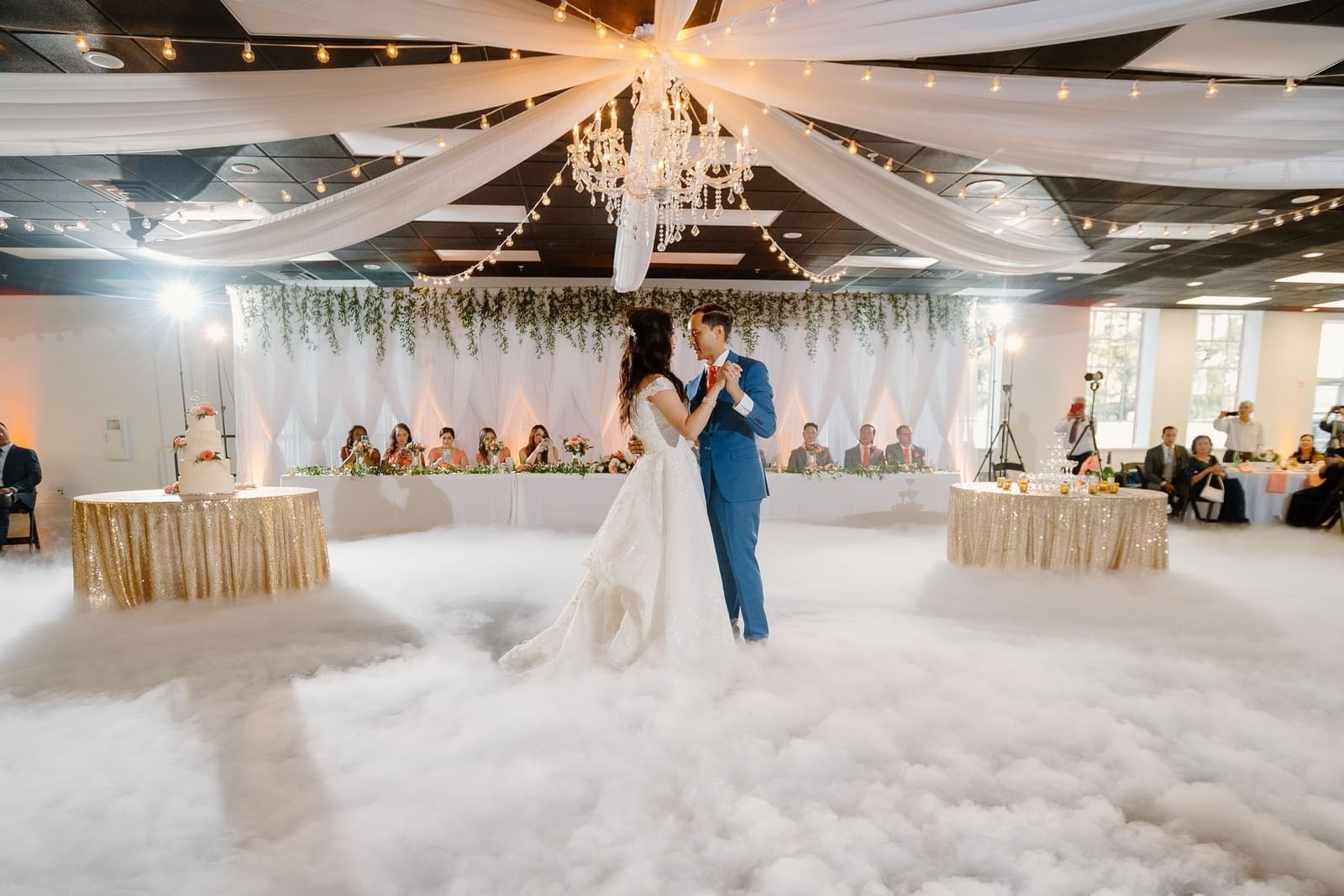 Mother fixing bride's wedding dress in a one bedroom suite